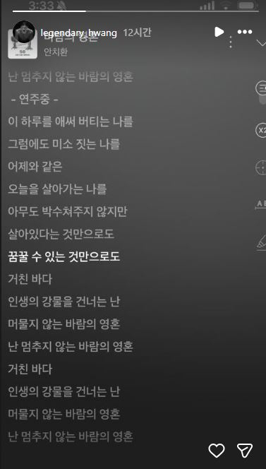 공개된 사진은 안치환의 ‘바람의 영혼’을 플레이 중인 화면을 캡쳐한 것이었다. 사진에는 “아무도 박수쳐주지 않지만 살아있다는 것만으로도 꿈꿀 수 있는 것만으로도” 등의 가사가 담겼다.