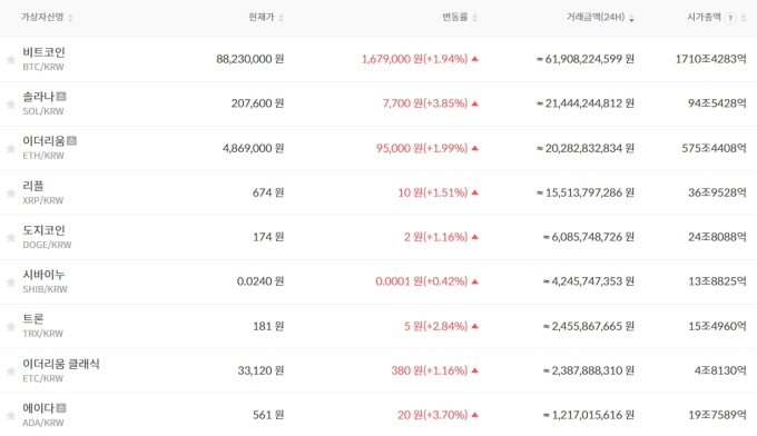 업비트 비트코인시세는 현재가 8820만6000원으로 전일대비 1,655,000원 상승했다. (등락률 +1.91%)