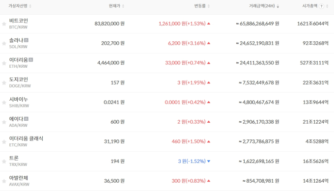 업비트 비트코인시세는 현재가 8388만0원으로 전일대비 979,000원 상승했다. (등락률 +1.18%)