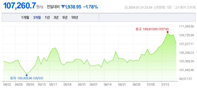 신한은행에 따르면 마지막 거래일 19일 고시기준 국내 금시세(금값)는 순금(24K) 시세는 1g당 107,260.70원으로 이전 금시세(금값)인 109,199.65원 보다 1,938.95원 (등락률 -1.776%) 하락했다.