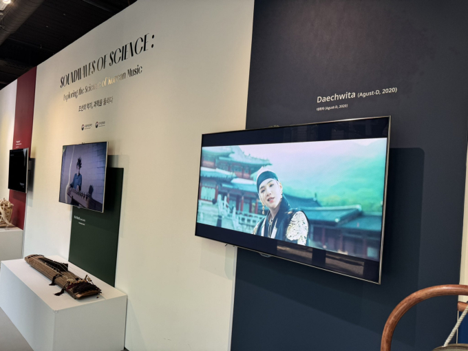 실제로 전시장 벽면에는 “Daechwita (Agust‑D, 2020)”이라는 캡션과 함께, Agust D의 ‘대취타’ 뮤직 비디오가 스크린을 채우고 있다. 벽면에는 또한 ‘조선의 악기, 과학을 울리다’는 전시 주제를 상징하는 문구가 큼직하게 걸려 있어, K-팝과 국악이 한 공간 안에서 자연스럽게 호흡하는 구성을 보여주고 있다.