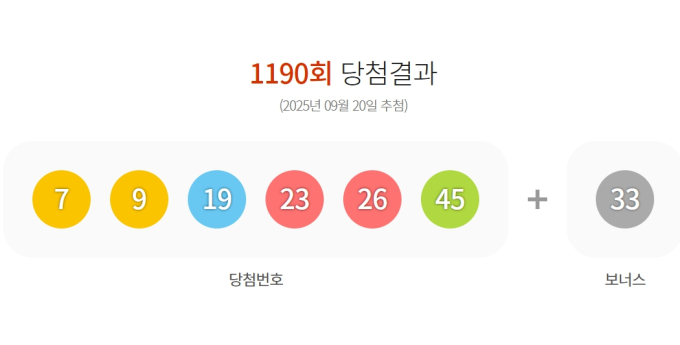 제1190회 로또 당첨번호 조회 결과 1등 당첨번호는 '7, 9, 19, 23, 26, 45' 로 나타났다.