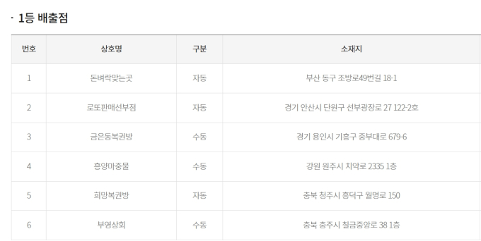 이번 주 로또 1등 당첨 판매점(로또 1등 당첨지역)은 아래와 같다.