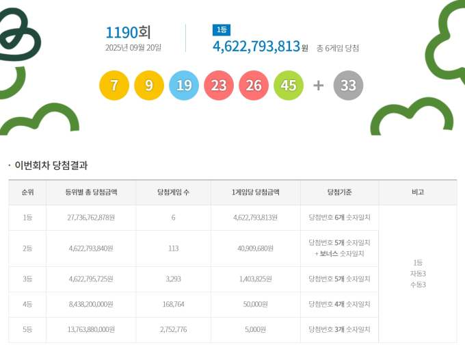 1190회 로또 당첨번호 6개 숫자를 모두 맞춘 1등은 각각 46억2279만3813원을 받는다.