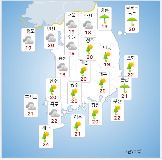 전국 주요 도시별, 지역별 아침 최저 기온은 △서울 19도 △인천 20도 △춘천 18도 △강릉 19도 △대전 20도 △대구 20도 △전주 20도 △광주 20도 △부산 22도 △제주 24도 △울릉도 독도 20도다.