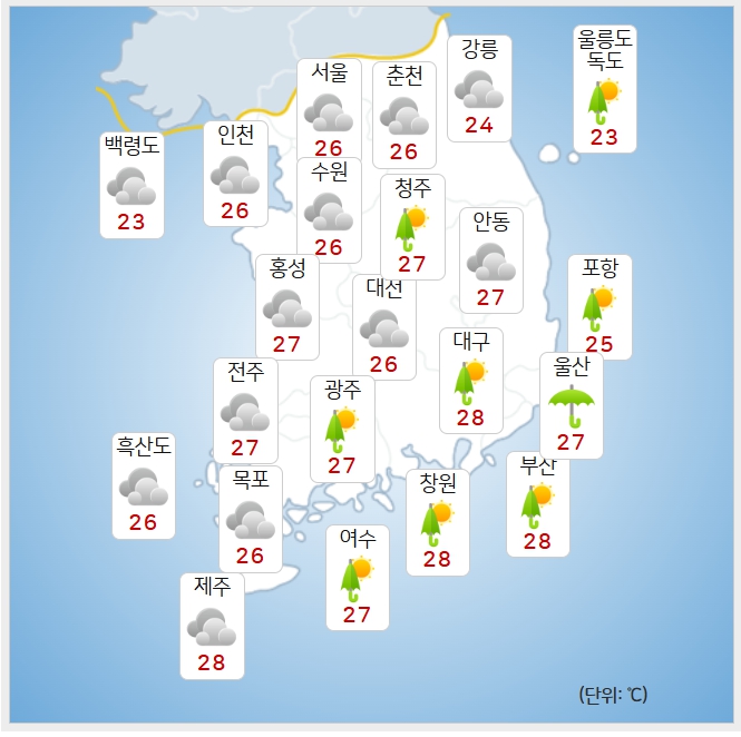 낮 최고 기온은 △서울 26도 △인천 26도 △춘천 26도 △강릉 24도 △대전 26도 △대구 28도 △전주 27도 △광주 27도 △부산 28도 △제주 28도 △울릉도 독도 23도로 예상된다.