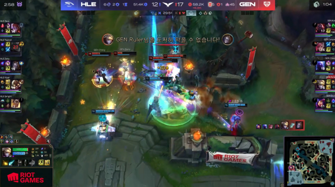 승기는 한화생명 쪽으로 기우는 듯했다. 한화생명은 네 번째 드래곤 앞에서 벌어진 한타에서 승리하고 드래곤 영혼을 획득했다. 이어진 바론 앞 한타에서도 승리하며 바론 버프까지 손에 넣었다. 바론 버프와 드래곤 영혼을 모두 두른 한화생명은 젠지의 본진으로 진격해 넥서스 파괴 직전까지 다가섰다. 젠지의 쌍둥이 포탑은 모두 파괴되었고, 넥서스의 체력도 얼마 남지 않은 절체절명의 순간이었다.
