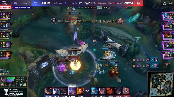 25분경 내셔 남작 앞에서 벌어진 교전에서 젠지는 뛰어난 어그로 핑퐁과 집중력으로 대승을 거뒀고, 내셔 남작 버프를 획득하며 승부에 쐐기를 박았다. 젠지는 그대로 한화생명의 본진으로 진격해 넥서스를 파괴하고 2025년 LCK의 최종 승자가 되었다.